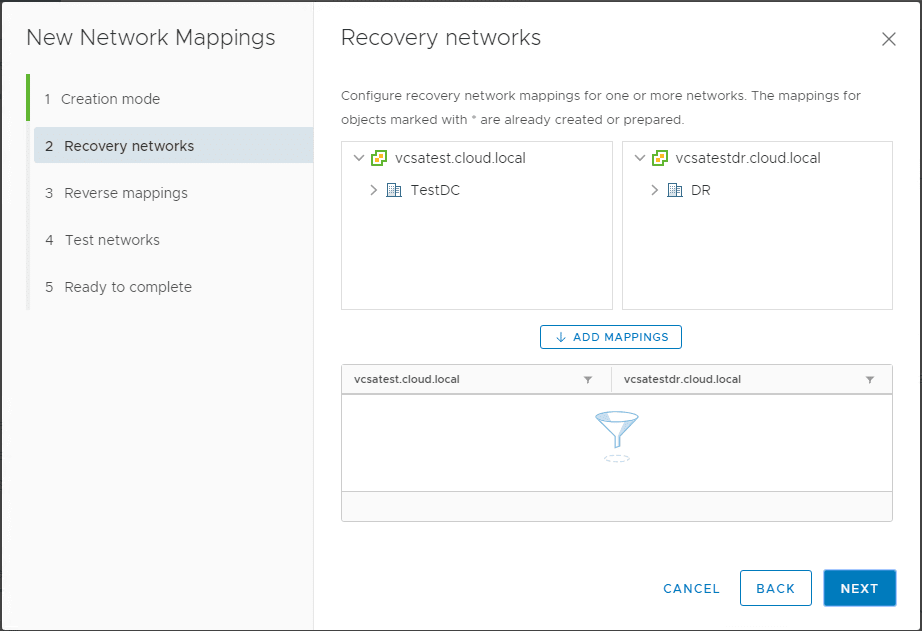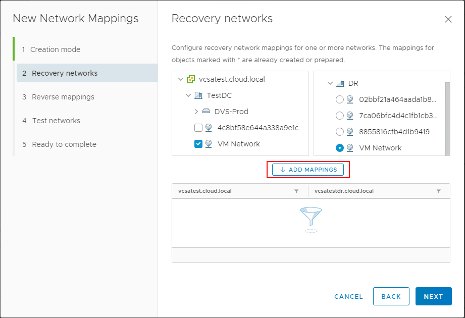 Here I am simply selecting theย VM Network label at each site then clicking the Add Mappings button.