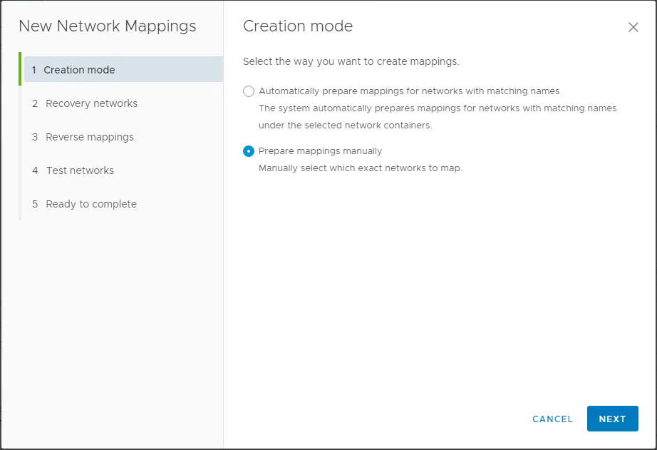 Here I am selecting toย Prepare mappings manually.ย You can have the wizard automatically prepare the mappings by mapping the matching names together at each site.
