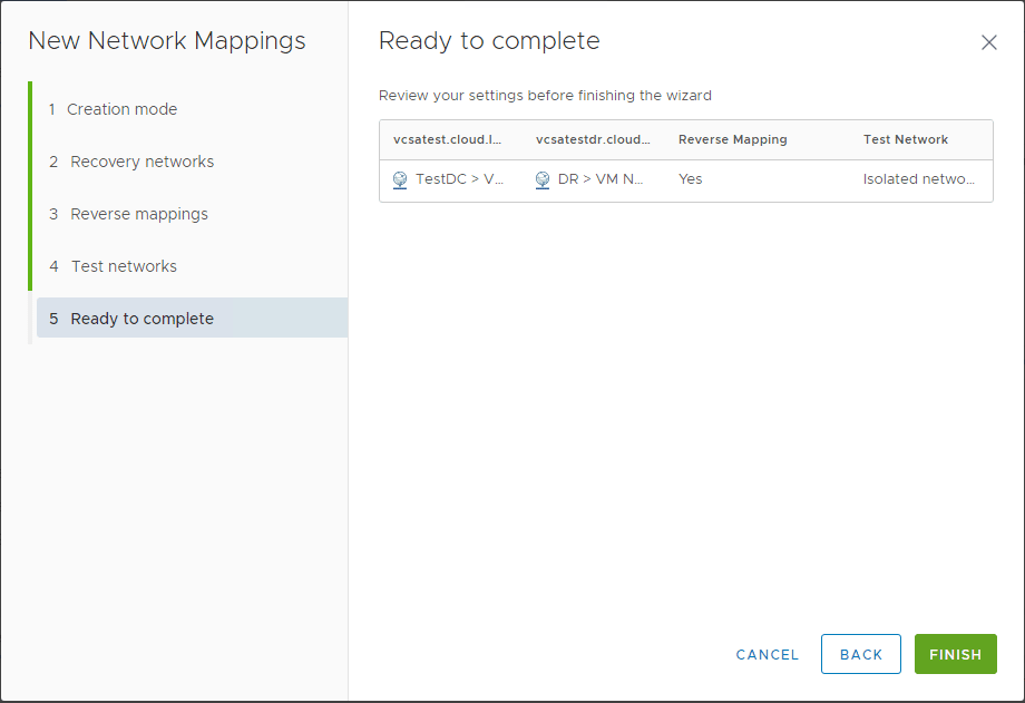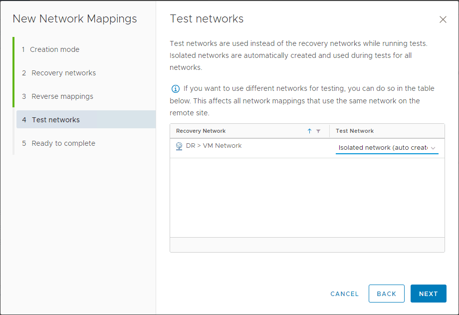 Theย Test Network are used instead of the recovery networks while running tests of the recovery plan.ย The isolated networks are automatically created and used during the tests for all networks.