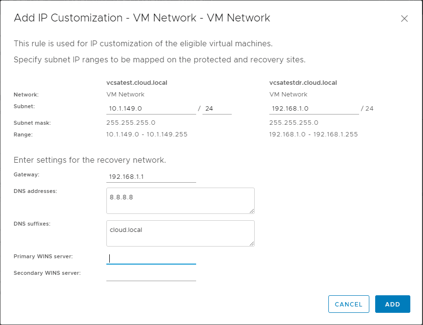 Theย Add IP Customization box pops up, allowing us to configure the source IP range at the protected site and then defining the resulting IP subnet range at the recovery site.ย Site Recovery Manager will look at the IP address of statically assigned virtual machines in the recovery site and see if they match the source range.ย If they do, it will then look at the target subnet that needs to be configured and replace the network bits with the configured network range of the resulting subnet at the recovery site.ย You also have the ability to configure the gateway, DNS suffixes, Primary WINS server and Secondary WINS server.