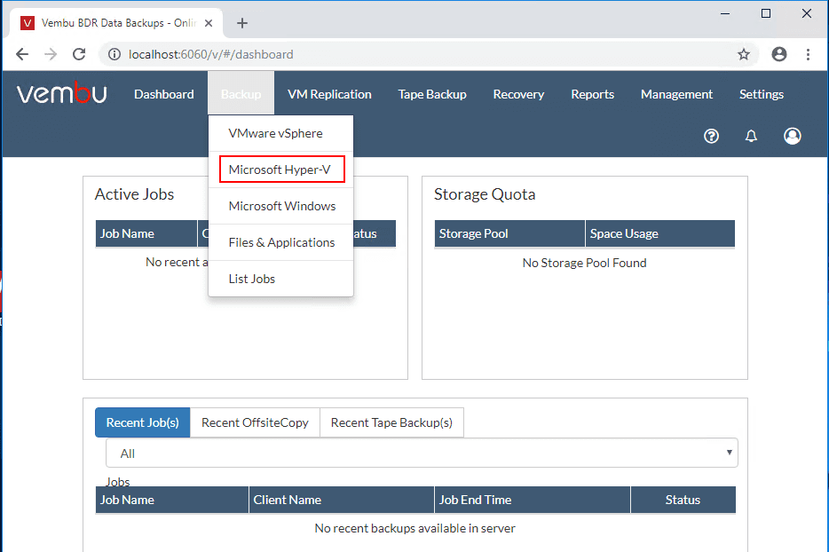 After adding Storage Pool storage, Vembu BDR Suite v4.0 is basically ready to start adding virtual infrastructure to start performing backups.ย To add a Hyper-V cluster for backup, navigate toย Backup > Microsoft Hyper-V.