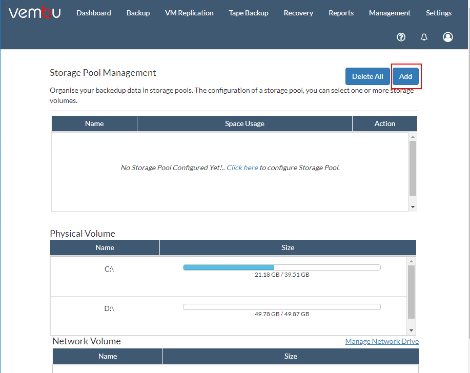 One of the first things that you will be prompted to do after setting the BR Suite ID, you will need to setup theย Storage where the backups are going to be housed. Theย Storage Pool Managementย screen is where weย Add the storage to the pool.