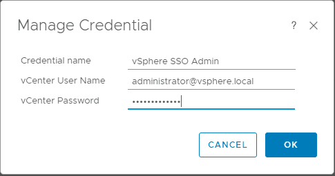 Again, this launches theย Manage Credential dialog box that is identical to what you use to configure the vCenter Server adapter instance.ย Populate your credentials and then click theย OK button.