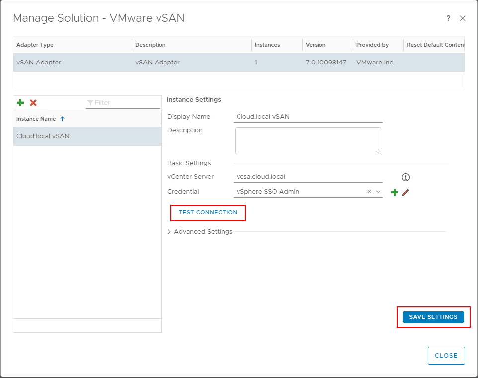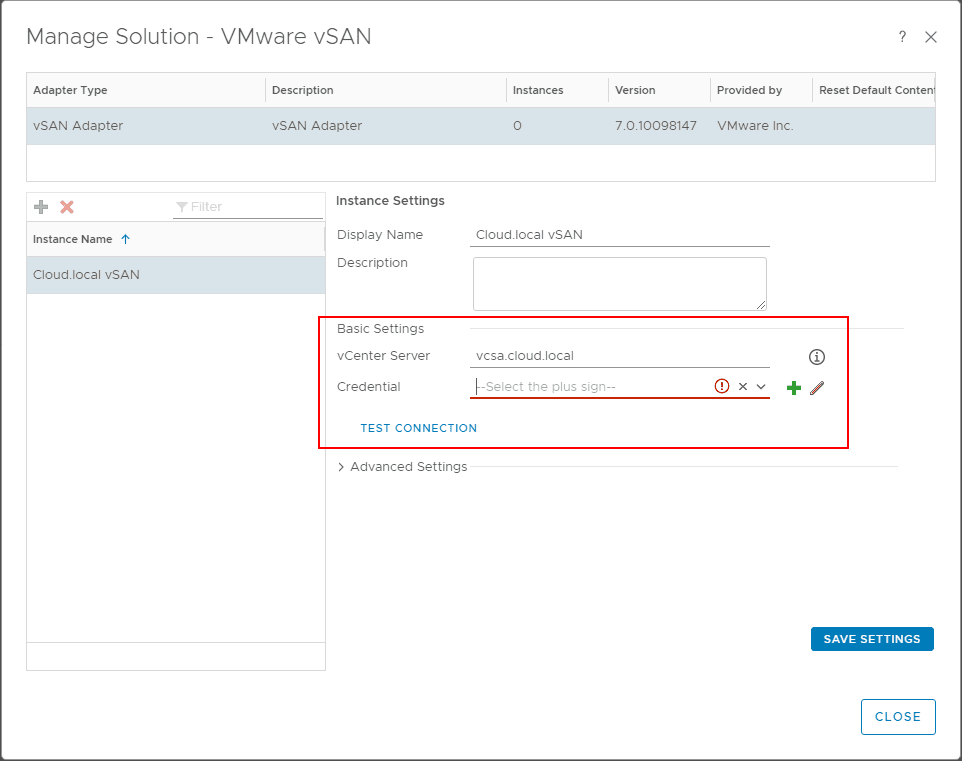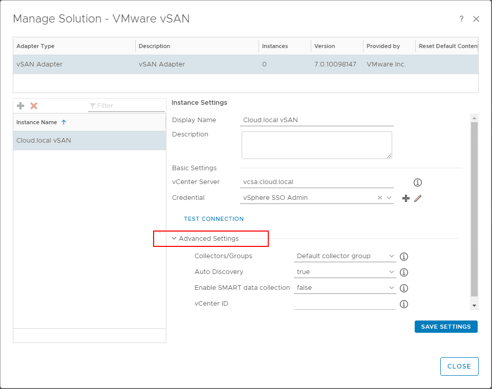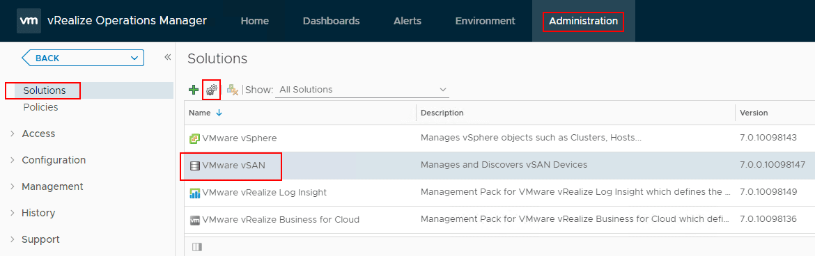 After logging in, you can navigate toย Administration > Solutions > VMware vSAN and choose the settings “cog” under theย Solutions heading.ย This launches a configuration window similar to the configuration of the vCenter Server connection in vRealize Operations 7.0.