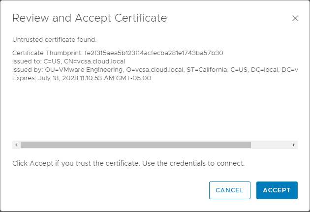 If you choose to eitherย test orย save the configuration, you will be presented with the certificate for the vCenter Server.ย Clickย Accept to accept it and make the connection.