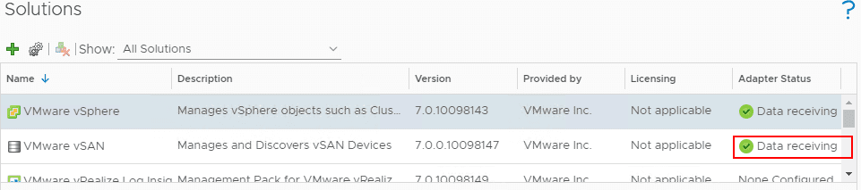 As is the case with theย VMware vSphere adapter instance, you should see theย Data receiving “Adapter Status” displayed in the Solutions window.ย This indicates the VMware vSAN adapter is talking to the vSAN environment.