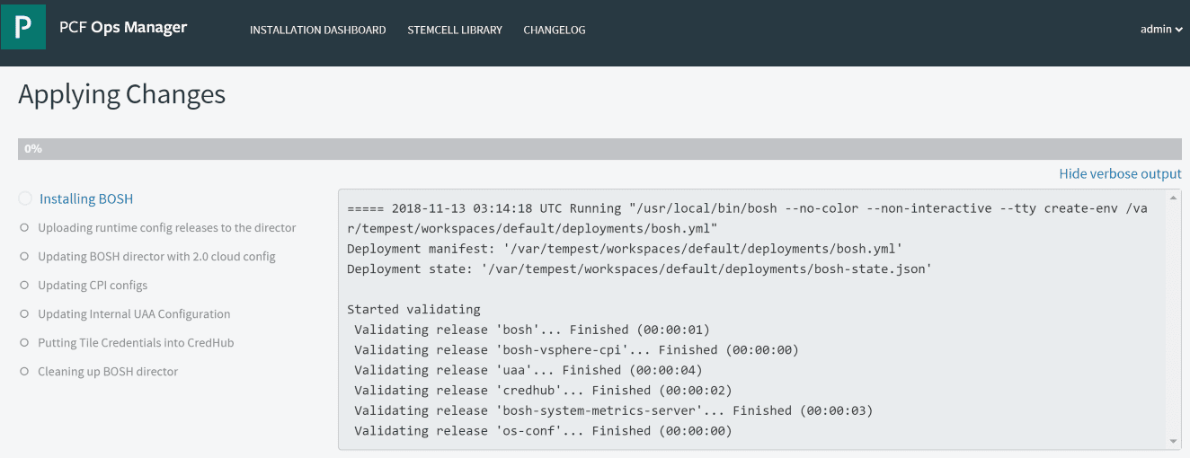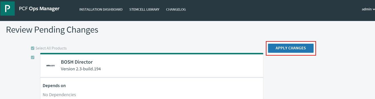 This will initiate the Applying Changes process which will installย BOSH and deploy your other infrastructure VMs in vSphere among other things.