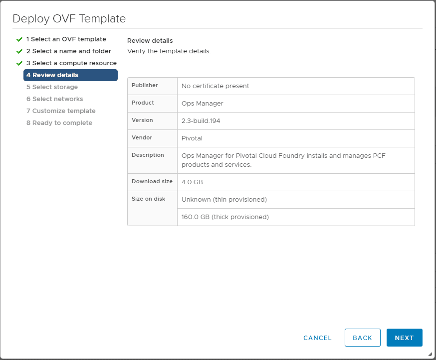 The first thing we need to do is install the PKS PCF Ops Manager product in our VMware vSphere environment.ย For my lab environment, I am installing the OVA into a two-node vSAN cluster.ย The overview of the process is not that much different than any OVA: