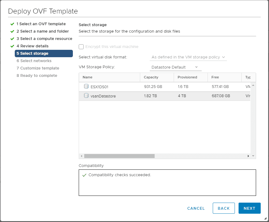 Select the datastore that will be used to store the appliance VM files.