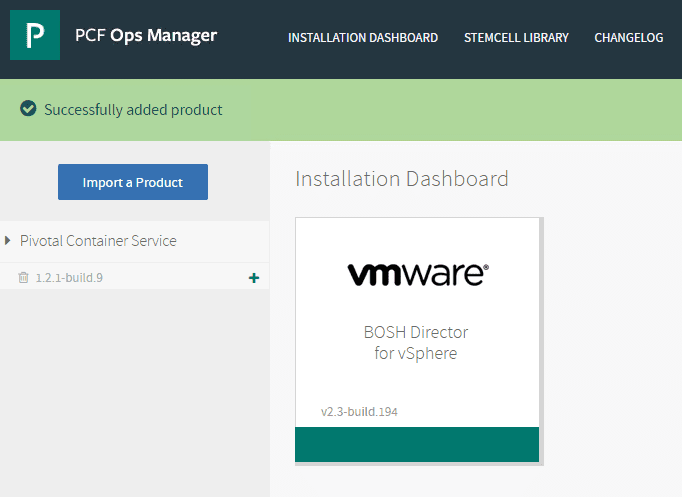 After a while, you should seeย Successfully added product message.ย Click the greenย +ย sign next to the build of Pivotal Container Service.ย This will add it to the dashboard.