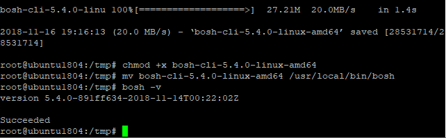 wget https://s3.amazonaws.com/bosh-cli-artifacts/bosh-cli-5.4.0-linux-amd64 chmod +x bosh-cli-5.4.0-linux-amd64 mv bosh-cli-5.4.0-linux-amd64 /usr/local/bin/bosh