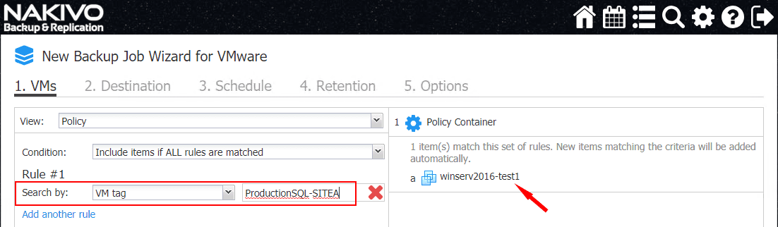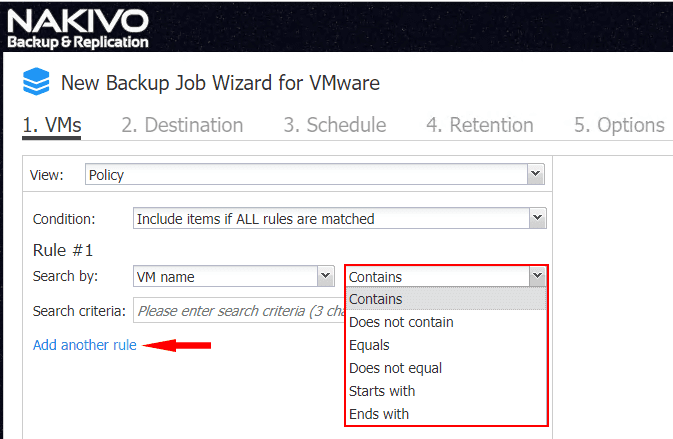 NAKIVO Backup & Replication 8.1 policy-based data protection gives a wide range of parameters to define the rules listed in the policy.ย The policy is defined by rules that can be created with various logic options.ย ย You can set the following in the first drop down box of the rule found in the Search by line: