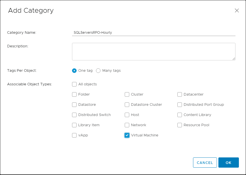 Below, the SQLServersRPO-Hourly category will house any tags we want to associate with that particular RPO value or any other descriptive attributed we want to assign.