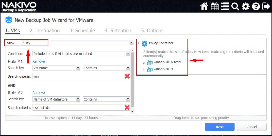 Withย policy you can define a set of parameters and make sure your environment meets those parameters.ย With policy-based data protection, NAKIVO offers functionality that allows IT administrators to define a way to identity virtual machines that exist in their virtual environments and then automatically base jobs from those parameters set in the policy definition.