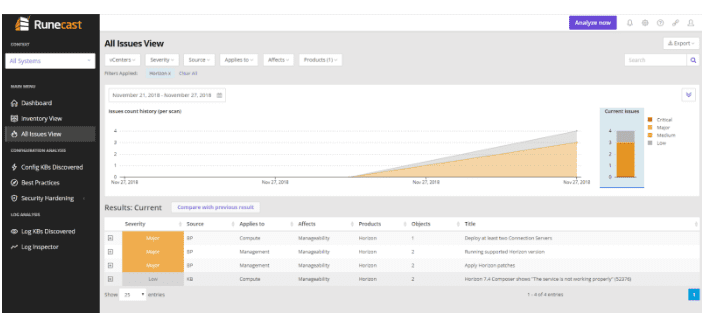 After youย scan VMware Horizon for Issues or Errors using Runecast Analyzer Beta, you will see any issues displayed in theย All Issues View among others.