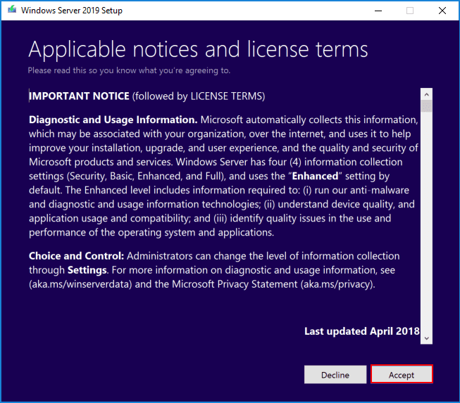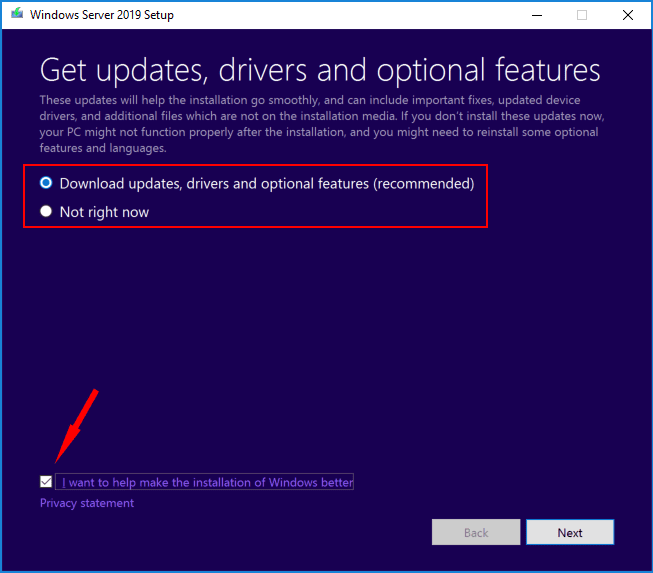 So, here, I have simply uploaded the Windows Server 2019 ISO to my datastore and mounted to my domain controller.ย I am running the interactive upgrade installer from Windows Server 2016 installed on my domain controller.ย The first screen that lauches asked if you want to download updates, drivers, and optional features which is usually the recommended approach to take.ย You can also opt in or out of the CEIP process at the bottom left hand corner of the first screen.