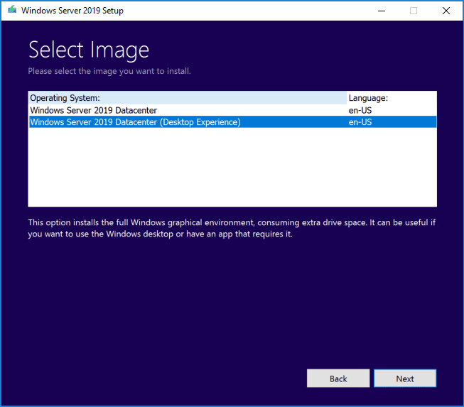 The upgrade will recognize the variant of legacy OS you are coming from and present the correct option for upgrade.ย Since I am coming from Windows Server 2016 Datacenter, these are the options that are presented.ย Here I am choosing theย Desktop Experience version to install the GUI.