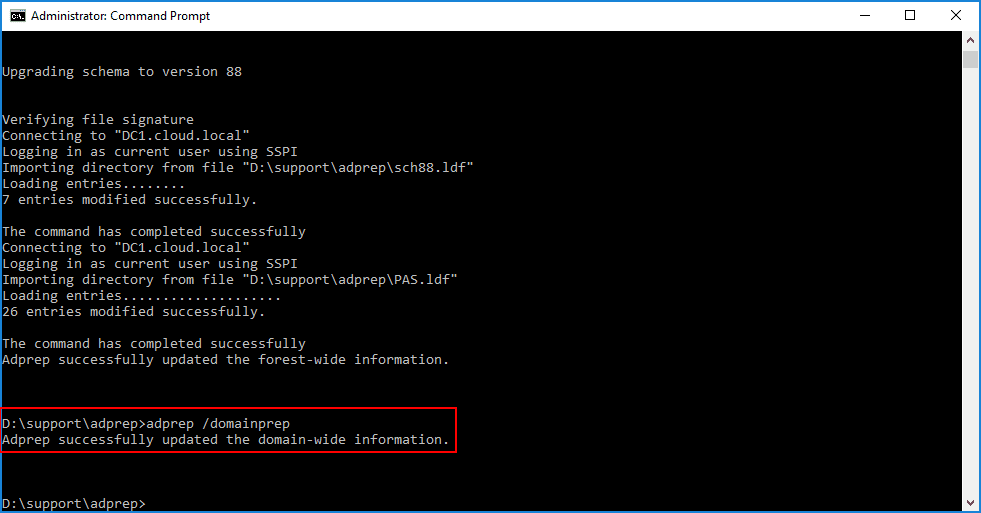 Next, we apply the domainprep process.ย This only takes a second and you will see the adprep successfully updated the domain-wide information message.