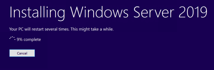 After clickingย Next, you will see theย Installing Windows Server 2019 splash screen appear.