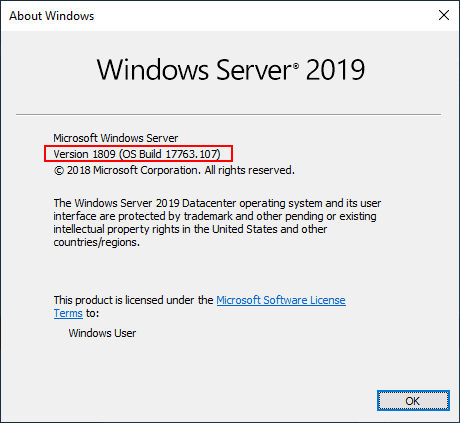 After a while, you will be able to login to the Windows Server 2019 domain controller that is now upgraded.ย A quickย winverย command should display Windows Server 2019, version 1809 (OS Build 17763.107) at the time of this writing and ISO version.