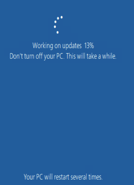 As noted in the screen above, the process will reboot the server several times to complete the upgrade.ย You will see the familiarย Working on updates displayed with a percentage as the process works through.