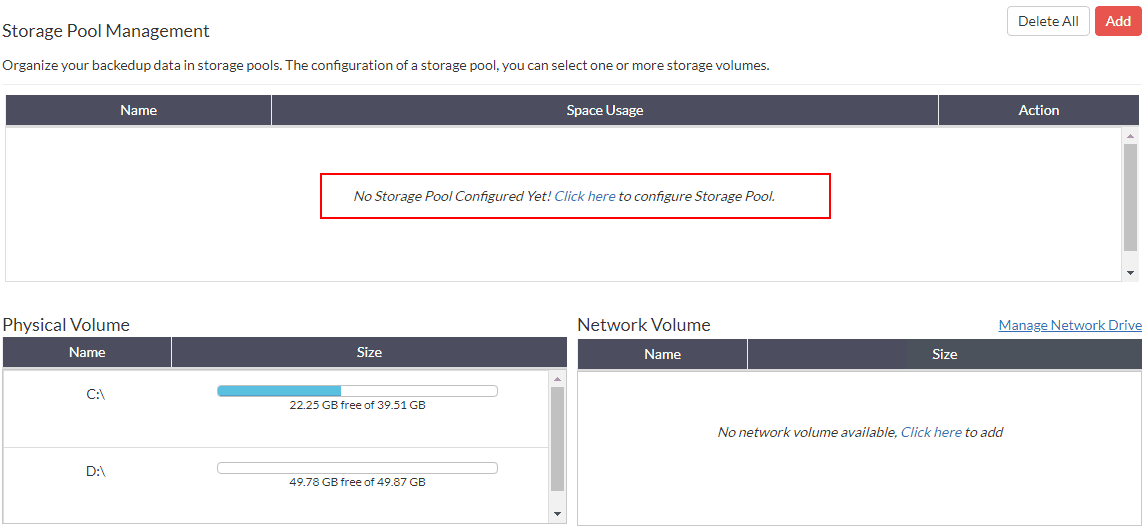 Vembu has also streamlined the workflow of the initial configuration in that you are prompted to configure your backup storage right from the start.ย After you login for the first time, you will be taken to the Storage Pool configuration.ย From here you can click to configure your Storage Pool.ย This allows choosing the drives to be used as part of the pool.