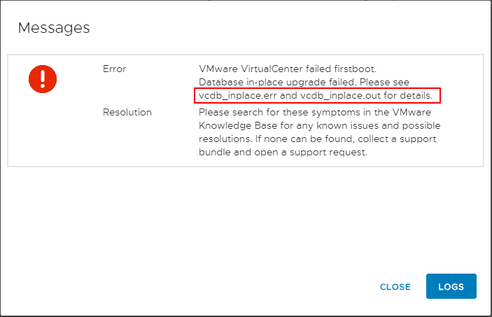 As directed by the above error message, I downloaded the logs bundle and looked at the vcdb_inplace.err file and recorded the following error.