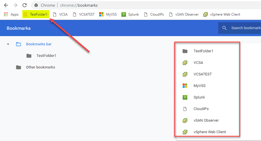Below is an example of a Chrome Bookmarks bar containing individual links as well as folders. Below you see the TestFolder1 that I have created to demonstrate how to export a single bookmarks folder from Chrome using a method to be described. As you can see there are many other bookmarks that I don’t want to be included in the export of bookmarks, only the folder.