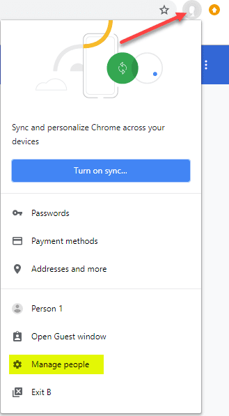 To create a new user in Chrome, navigate to the upper right hand corner and click the user icon (may be different icons depending on if this has been customized from the default). Click the Manage people option.