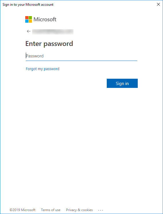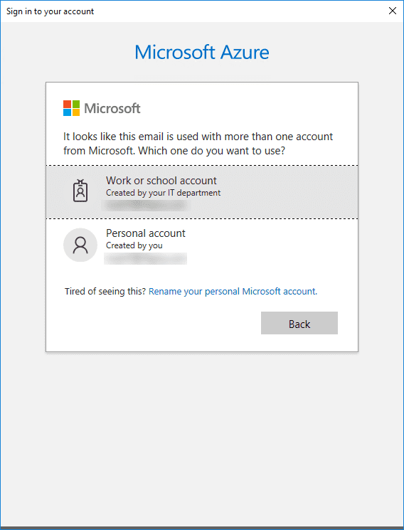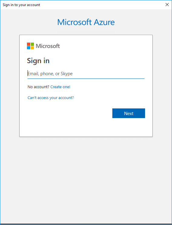 This will launch the normal Microsoft Azure portal login GUI screens, having you enter your Azure Portal email address, account type, and password.