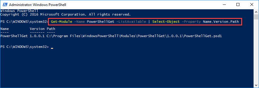 Get-Module -Name PowerShellGet -ListAvailable | Select-Object -Property Name, Version, Path