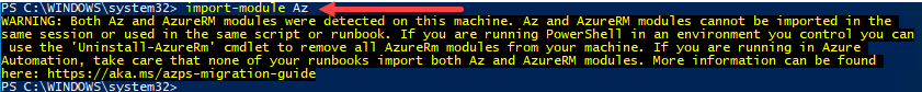 If customers have already uninstalled AzureRM module in favor of Az, they can run Az in “compatibility mode” to allow using existing scripts while working on updating those scripts to using the new syntax. An important consideration for the compatibility mode is to make sure that only the Az module is installed and AzureRM has been uninstalled.