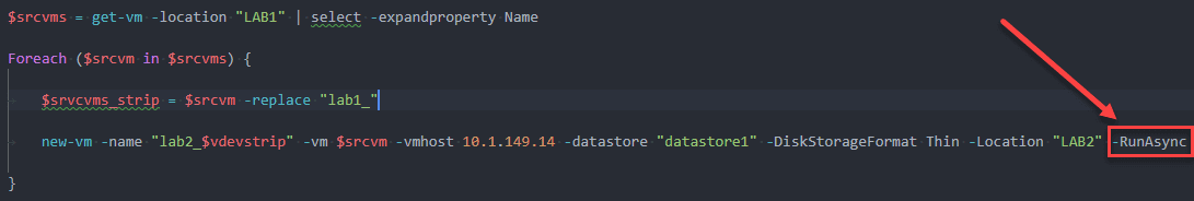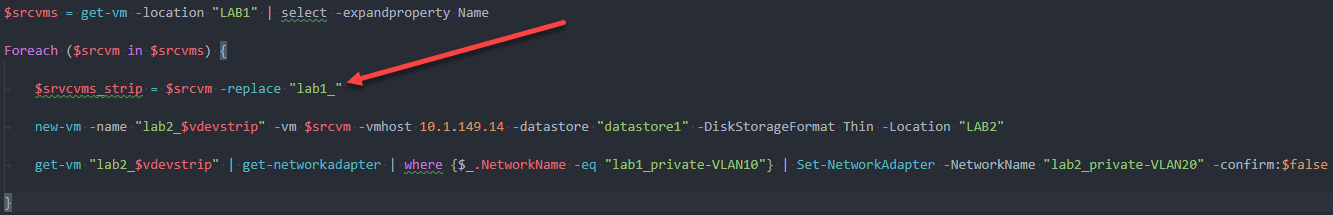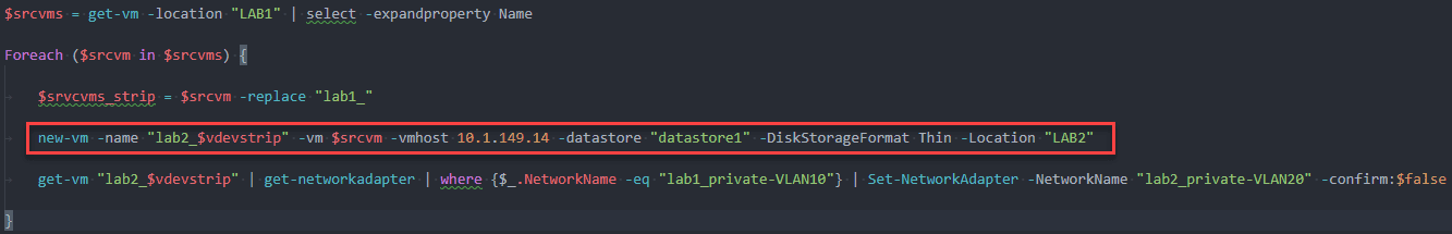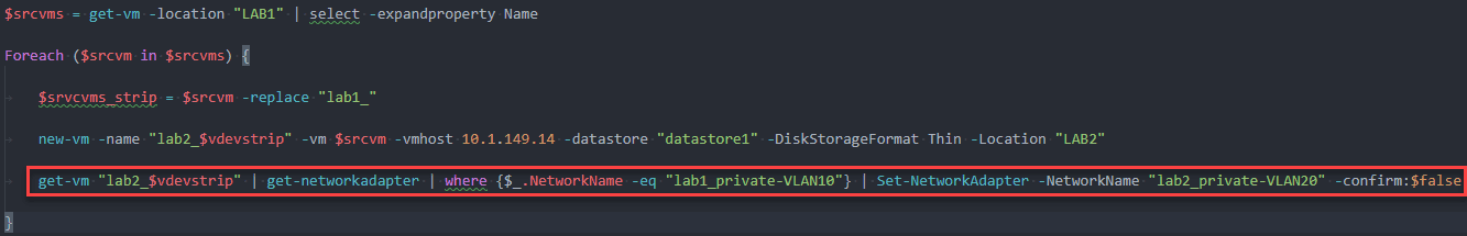 $srcvms = get-vm -location "LAB1" | select -expandproperty Name Foreach ($srcvm in $srcvms) { $srvcvms_strip = $srcvm -replace "lab1_" new-vm -name "lab2_$vdevstrip" -vm $srcvm -vmhost 10.1.149.14 -datastore "datastore1" -DiskStorageFormat Thin -Location "LAB2" -RunAsync get-vm "lab2_$vdevstrip" | get-networkadapter | where {$_.NetworkName -eq "lab1_private-VLAN10"} | Set-NetworkAdapter -NetworkName "lab2_private-VLAN20" -confirm:$false }
