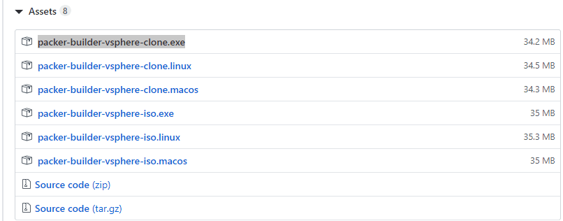 Now for the two plugins for Packer that allow interacting with VMware environments. As you can see, the vsphere-clone and vsphere.iso are available for various platforms. Since I am using Windows, here I will download both the .exe files.