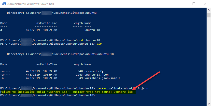 Just a note on the behavior you will see if you try to use a Packer template that requires the vsphere-iso plugin, you will see the following error: