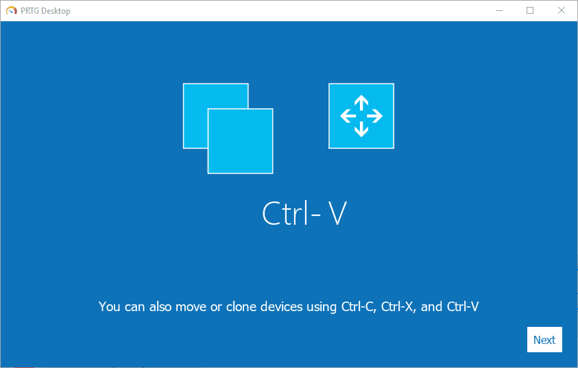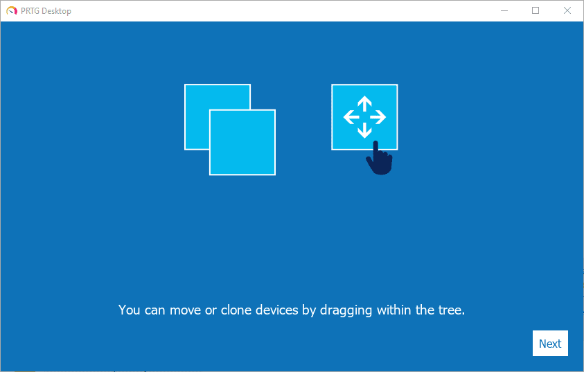 After configuring your connection, you will see a few screens of tips and functionality in PRTG Desktop. The first is a note about being able to drag and drop objects in the interface.