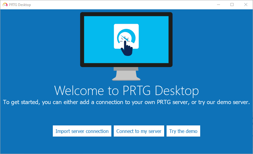 PRTG Desktop recognizes if a connection to a PRTG server exists in the form of the Enterprise Console which previously was the native “fat” client installation of PRTG. If you have that installed, you will see the Import server connection which will bring your connection details over from Enterprise Console to the new PRTG Desktop app. If you simply want to configure a connection manually, click the Connect to my server button.