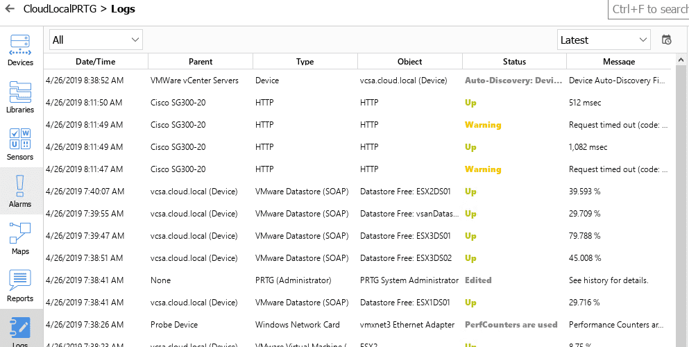 The Log view is a more verbose view of the environment showing active logs including statuses, errors, devices, etc.