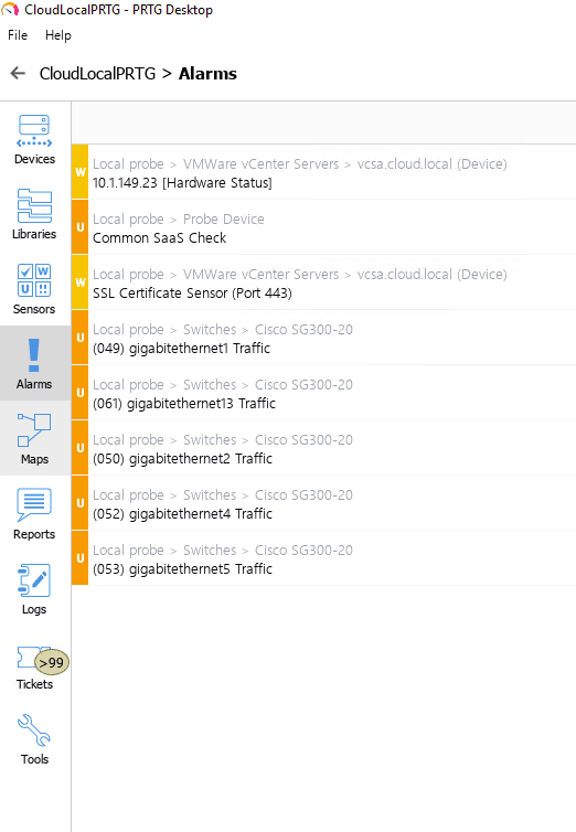 The design of the PRTG Desktop app is very modern with the various components of the app accessible from a left-hand sidebar menu. You have access to devices, libraries, sensors, alarms, maps, reports, logs, tickets, and tools and easy navigation between them all.