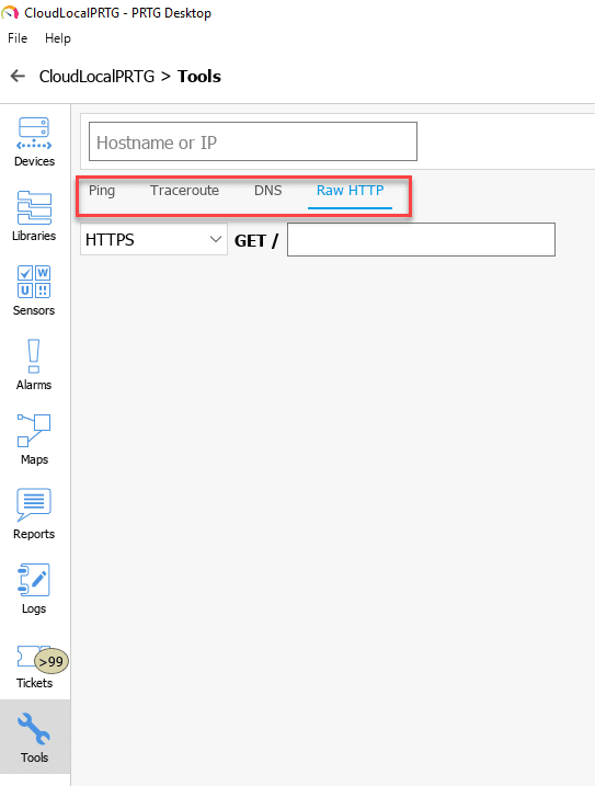 While not a wealth of tools, the (4) tools built into the interface are extremely helpful in setting up sensors. The Raw HTTP tool is helpful in content checks that you want to throw a sensor on. Of course the general ping, traceroute, and dns tools are helpful as well.