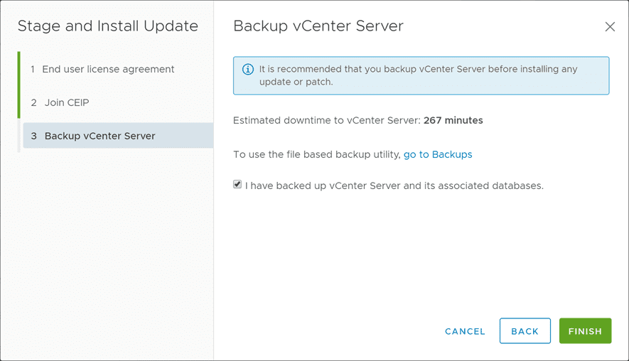 On the third and last step, select that you have backed up vCenter Server and its associated databases before you will have the option to Finish. One thing to notice and I have seen this before is the Estimated downtime to vCenter Server time can be wildly inaccurate. I can assure you that I ran through the update after seeing this screen and it was not down for 267 minutes! Anyways, something to take note of and not necessarily rely on.