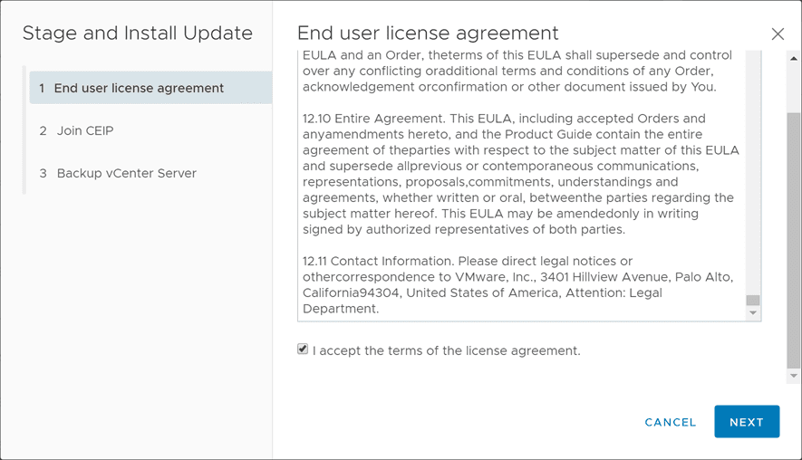 This begins the Stage and Install Update wizard. Scroll down on the EULA and check the “I accept” checkbox, then click Next.