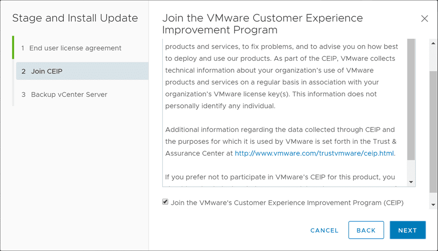 On the second step, you have a choice to Join CEIP or not. Make your selection here and click Next.