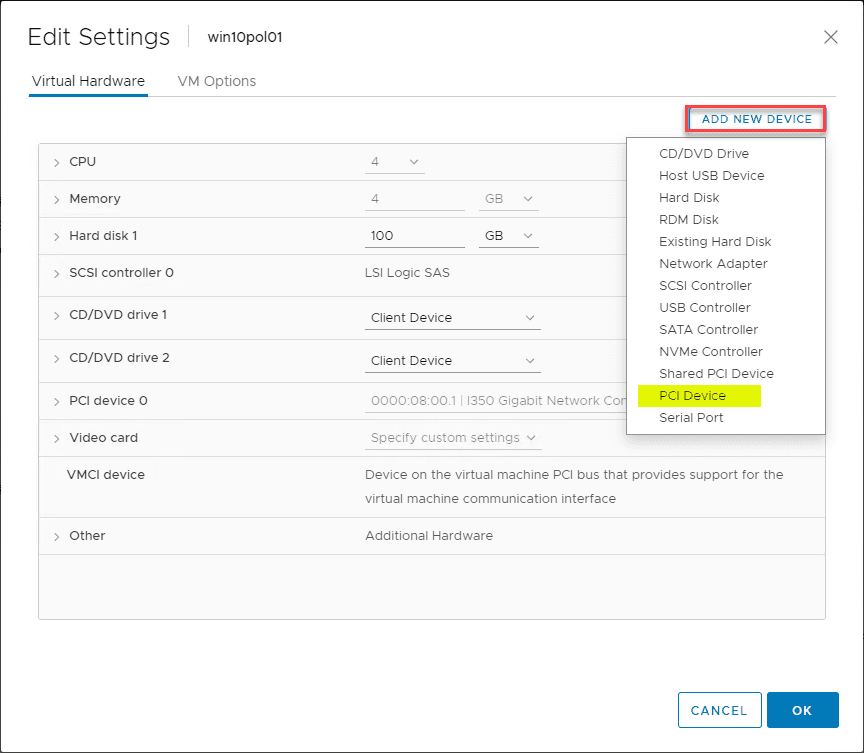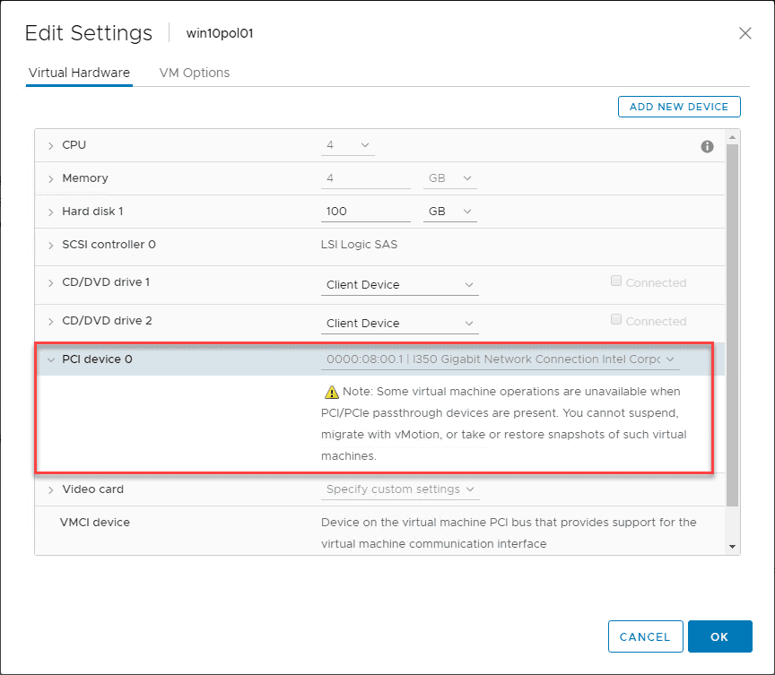 The card is successfully added. As noted here in the properties of the VMware virtual machine properties, you need to be aware of a few considerations when you PassThrough physical PCI devices. Some virtual machine operations are unavailable when PCI/PCIe passthrough devices are present. You cannot suspend, migrate with vMotion, create, or restore snapshots.