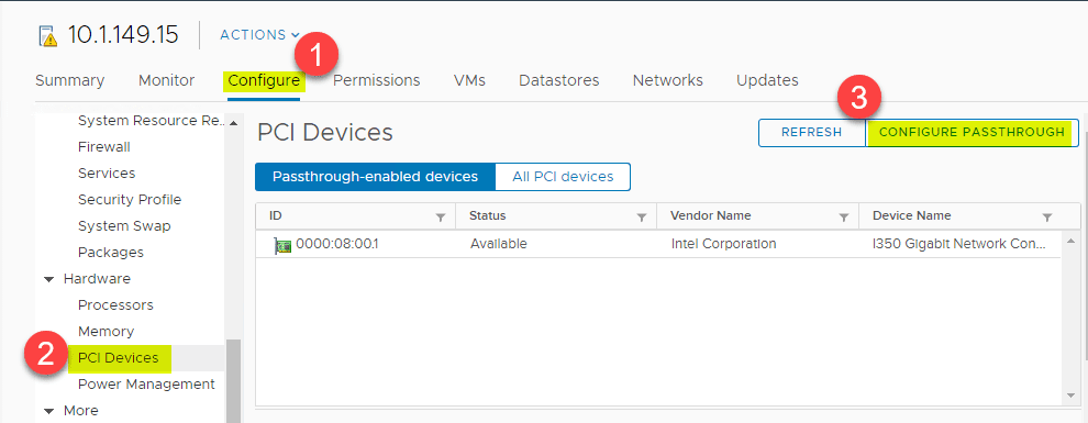 The steps to enable PCI PassThrough for a physical NIC adapter on the ESXi host is fairly straightforward. To do this, navigate to the ESXi host > Configure > Hardware > PCI Devices > Configure PassThrough.