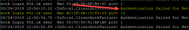 On my Extreme switch, in the logs, I saw the following: Authentication failed for Network Login 802.1x user with the MAC.