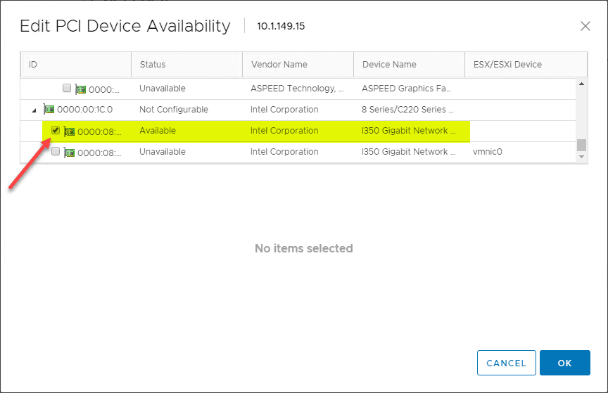 Select the specific PCI device you want to passthrough to the virtual machine. In my case it is the Intel i350 Gigabit Network controller found on the host.