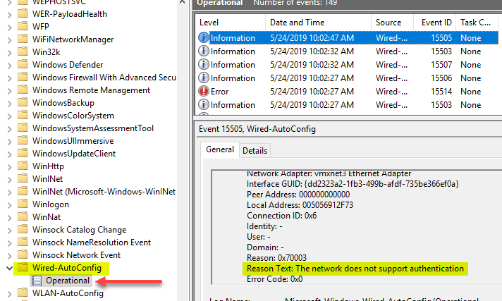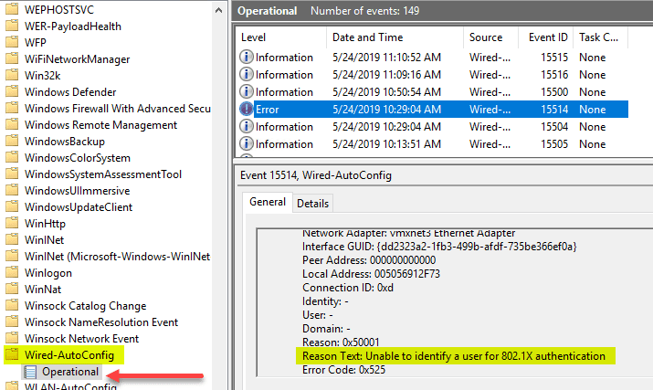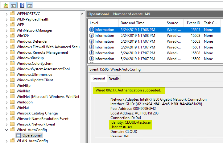 Now, when logging into the VMware virtual machine, 802.1X authentication works as expected. As you can see in the Wired-AutoConfig log, the identity and user are correctly pulled and authenticated via RADIUS.