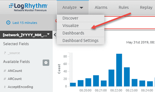 Perhaps the area you want to focus your attention when you first login is found under the Analyze menu. Under this menu, you have the Discover, Visualize, and Dashboard options. This is where you will look to discover and consume most of the data the solution will capture.