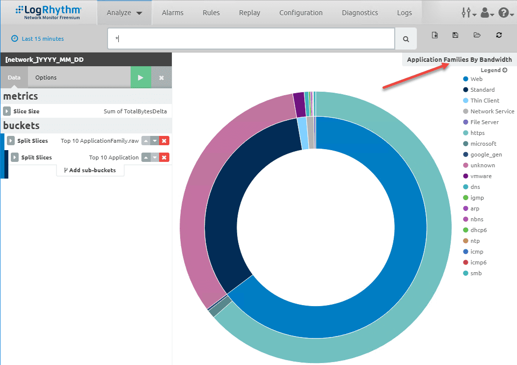 Finding bandwidth usage can sometimes be a challenge in various environments. With LogRhythm Netmon Freemium, you can see the Application Families by bandwidth to view the applications being used and which applications are the “top talkers” on the network in terms of bandwidth used.
